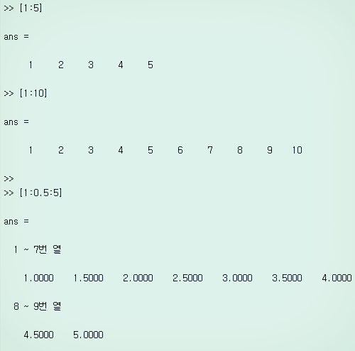- [1:0.5:5] : 1부터 0.5씩 5까지