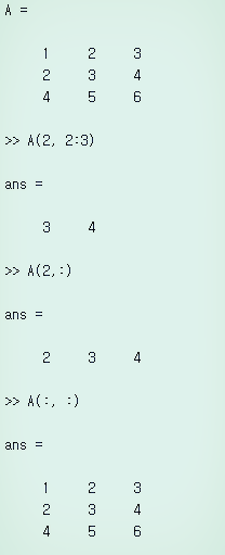 - A(2, 2:3) : A행렬의 2행의 2-3열을 뽑아낸다