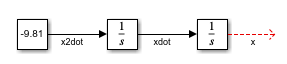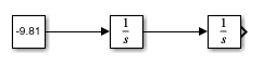 질량은 서로 약분되므로 고려하지 않고, g를 2번 적분하면 x가 나오는 것을 알 수 있다. 따라서 적분기 2개를 배치하고 Constant 블록과 연결해보자. 적분기는 라이브러리 - Continuous - Integrator 블록을 이용하여 추가할 수 있다.