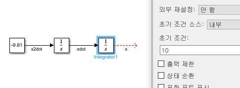 이제 초기조건을 지정해보자. 초기조건은 x의 초기조건이므로 2번째 적분기에 초기조건을 지정해야한다. 2번째 적분기를 더블클릭하여 초기조건을 10으로 설정한다.
