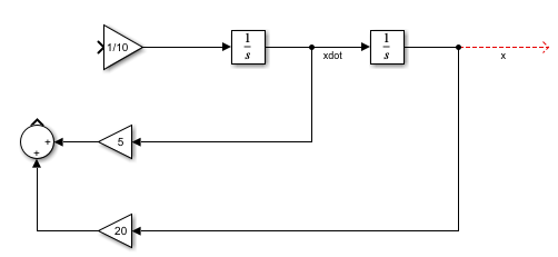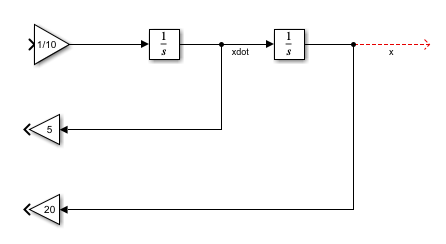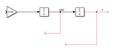 첫번째 적분기의 출력을 xdot, 두번째 적분기의 출력을 x로 설정해보자.