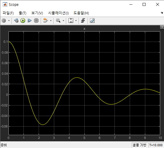 이제 결과를 확인하기 위해 Scope 블록을 추가한다. Scope 블록은 x 신호를 입력으로 받으므로 변위-시간 그래프가 나올 것이다.