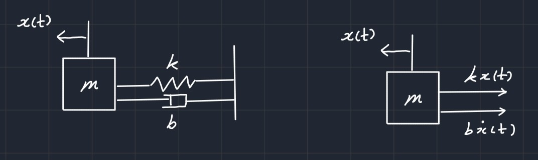 이번엔 2차 미분방정식의 대표적인 형태인 진동-감쇠 시스템을 다뤄보자. 진동 문제의 자유물체도는 다음과 같다.