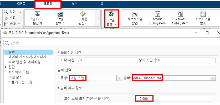 먼저 모델링 탭 - 모델설정 을 들어가면 시뮬레이션 시간과 솔버선택이 있다. 솔버 선택에서 가변스텝을 고정스텝으로 변경하고, ode4(Rounge Kutta method)를 선택한다(Rounge Kutta method가 가장 많이 쓰이는 수치해석 방법이다)