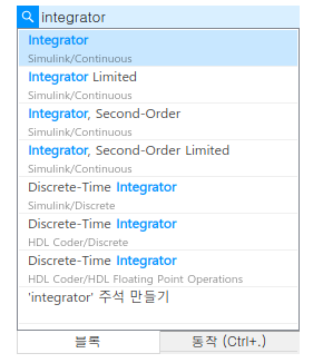 블록을 추가하는 다른 방법으로는 work space에 블록의 이름을 입력하여 바로 추가할 수 있다. 다음 그림은 이 방법을 이용하여 Integrator 블록을 추가한 예이다.