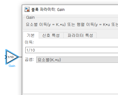gain 블록을 추가하고 블록을 더블클릭하여 이득을 1/10으로 설정한다. 여기서 이득을 1/10으로 설정하는 이유는 오른쪽의 신호를 받아 합치면 \(10 \ddot{x}\)이 되기 때문이다.