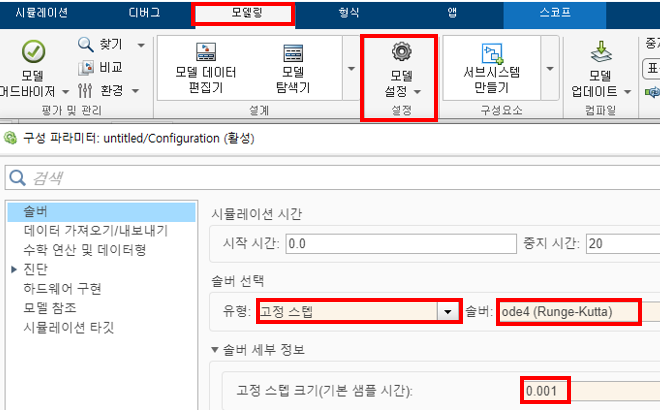 step size를 설정하기 위해 모델링 - 모델 설정 - 솔버 에서 솔버 유형을 고정스텝으로 솔버를 ode4로 변경하고, 솔버 세부 정보를 선택하여 고정 스텝 크기를 0.001로 설정한다.