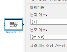 전달함수 블록을 더블클릭하면 분자와 분모를 설정 할 수있다. 작성하는 방법은 가장 높은 차수의 계수부터 행렬로 작성하면 된다. 또한 정의한 상수도 입력이 가능하다. 여기선 분자를 [1], 분모를 [m b k]로 작성한다.