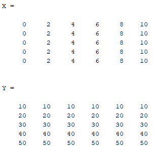 예시를 한 번 들어보자. x좌표를 0부터 10까지 2의 간격으로 가지게 하고, y좌표를 10에서 50까지 10의 간격으로 가지게 한 다음 meshgrid를 사용해보자.