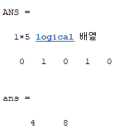 또한, 이 logical array를 y 행렬에 대입하면 2번째와 4번째 원소가 출력되는 것을 알 수 있다.
